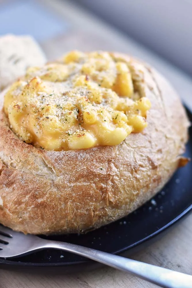 Serve our RTU Mac and Cheese hot, in a boule, topped with sourdough breadcrumbs and throw it all under the broiler until golden and bubbling.